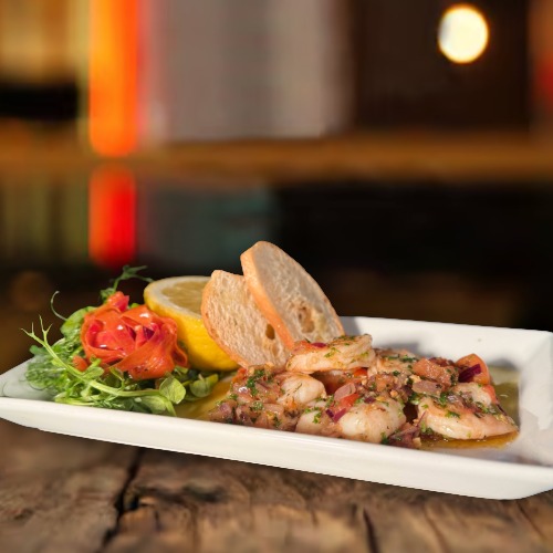 PRAWN & SPICED CHERRY TOMATOO - (NF, DF) Sautéed king prawns, spiced cherry tomatoes, Christina garnish. £12.95