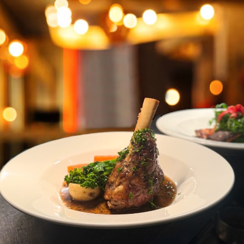 SLOW-COOKED LAMB SHANK (GF, NF, DF) Braised lamb shank, buttered new potatoes, seasonal vegetables, mint jus. EXTRA. £29.95